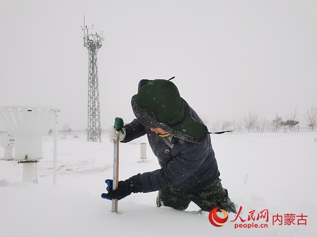 通遼市庫倫旗氣象局觀測場工作人員進(jìn)行加密雪深觀測。白向陽攝