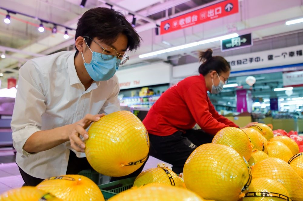 在滿洲里市慶客隆超市,工作人員在整理水果。新華社記者 李志鵬 攝