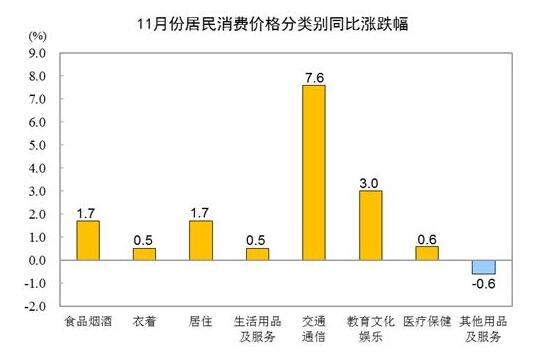 其他七大類價(jià)格同比六漲一降。其中,交通通信、教育文化娛樂、居住價(jià)格分別上漲7.6%、3.0%和1.7%,醫(yī)療保健、衣著、生活用品及服務(wù)價(jià)格分別上漲0.6%、0.5%和0.5%;其他用品及服務(wù)價(jià)格下降0.6%。