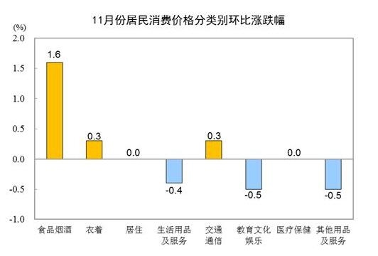 11月份,全國居民消費(fèi)價(jià)格環(huán)比上漲0.4%。其中,城市上漲0.3%,農(nóng)村上漲0.6%;食品價(jià)格上漲2.4%,非食品價(jià)格持平;消費(fèi)品價(jià)格上漲0.9%,服務(wù)價(jià)格下降0.3%。