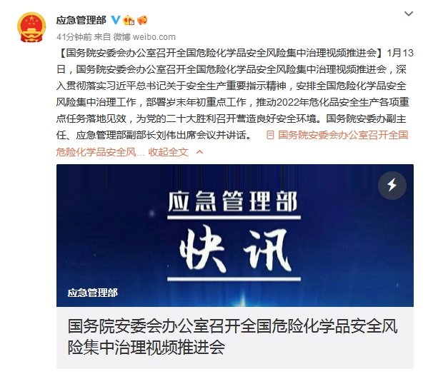 1月13日,國(guó)務(wù)院安委會(huì)辦公室召開全國(guó)危險(xiǎn)化學(xué)品安全風(fēng)險(xiǎn)集中治理視頻推進(jìn)會(huì),安排全國(guó)危險(xiǎn)化學(xué)品安全風(fēng)險(xiǎn)集中治理工作,部署歲末年初重點(diǎn)工作,推動(dòng)2022年?;钒踩a(chǎn)各項(xiàng)重點(diǎn)任務(wù)落地見效,為黨的二十大勝利召開營(yíng)造良好安全環(huán)境。