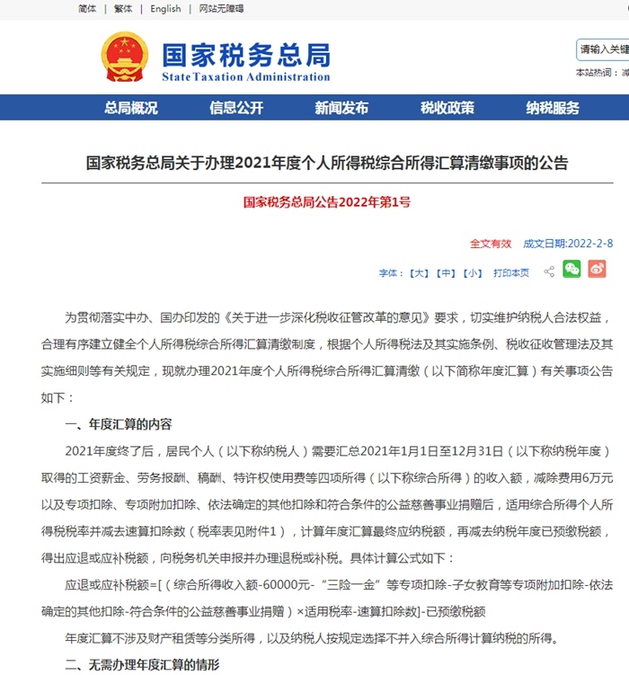 為貫徹落實中辦、國辦印發(fā)的《關于進一步深化稅收征管改革的意見》要求,切實維護納稅人合法權益,合理有序建立健全個人所得稅綜合所得匯算清繳制度,根據(jù)個人所得稅法及其實施條例、稅收征收管理法及其實施細則等有關規(guī)定,現(xiàn)就辦理2021年度個人所得稅綜合所得匯算清繳(以下簡稱年度匯算)有關事項公告如下: