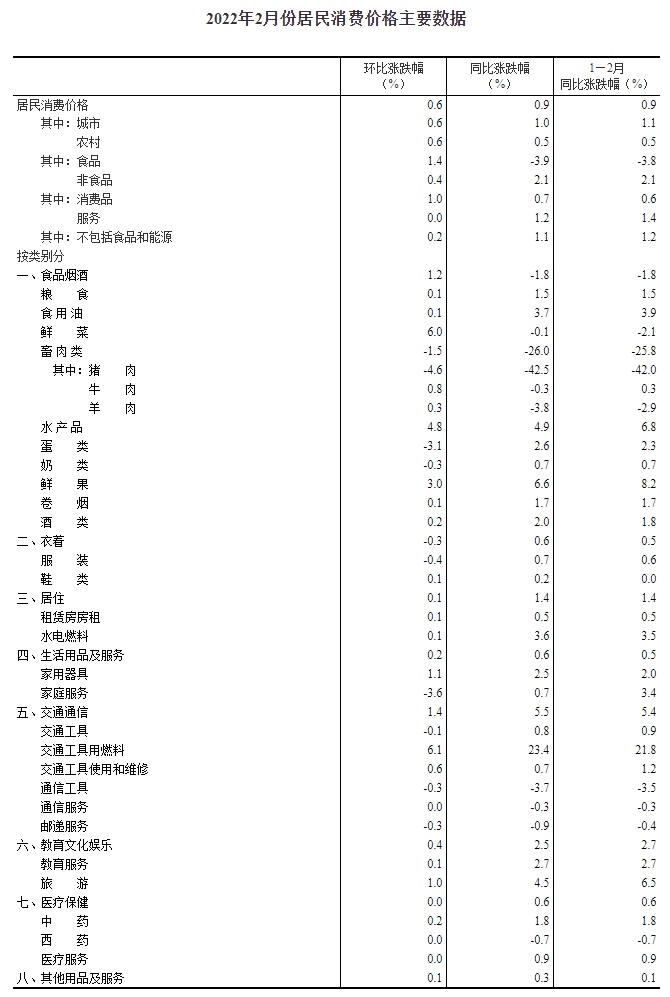 2022年2月份居民消費(fèi)價(jià)格同比上漲0.9% 環(huán)比上漲0.6%
