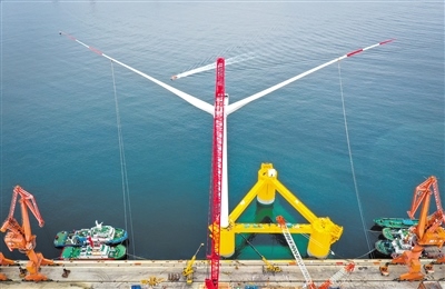 由中國船舶集團(tuán)海裝風(fēng)電股份有限公司牽頭,聯(lián)合相關(guān)單位自主研制的“扶搖號(hào)”浮式風(fēng)電機(jī)組浮體平臺(tái)上配備6.2兆瓦抗臺(tái)型I類風(fēng)力發(fā)電機(jī)組,在深遠(yuǎn)海應(yīng)用場將依靠九個(gè)對(duì)稱分布的懸錨鏈系泊實(shí)現(xiàn)固定。圖為完成總裝的國內(nèi)首臺(tái)深遠(yuǎn)海浮式風(fēng)電裝備“扶搖號(hào)”在茂名廣港碼頭靜待拖航(無人機(jī)照片)。記者劉大偉攝