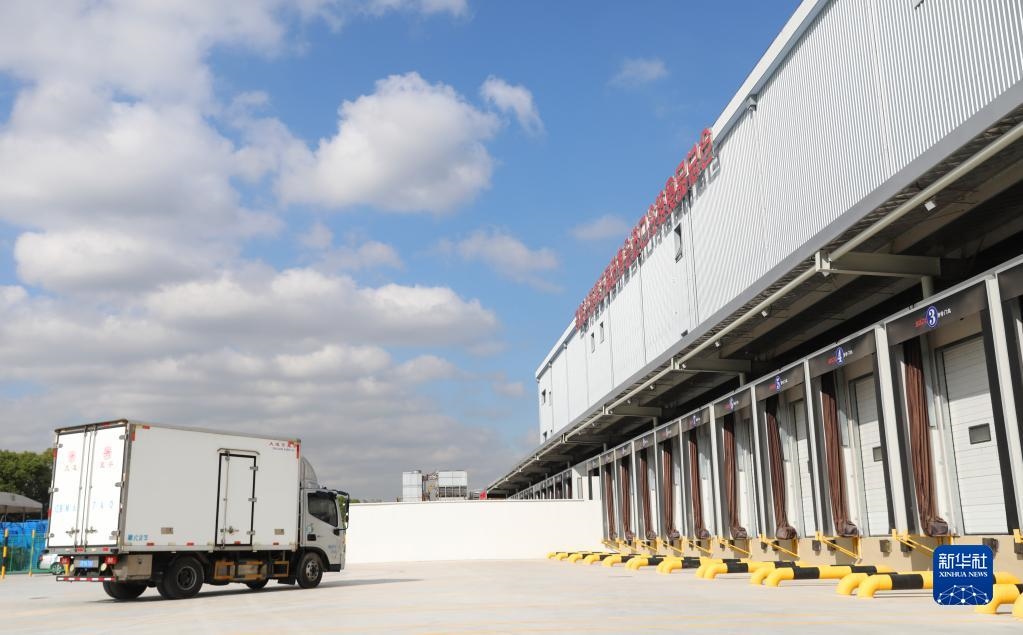 10月20日,裝載第一批進(jìn)口冷鏈?zhǔn)称氛蛊返目ㄜ囻側(cè)肟倐}(cāng)卸貨區(qū)域。新華社記者 方喆攝
