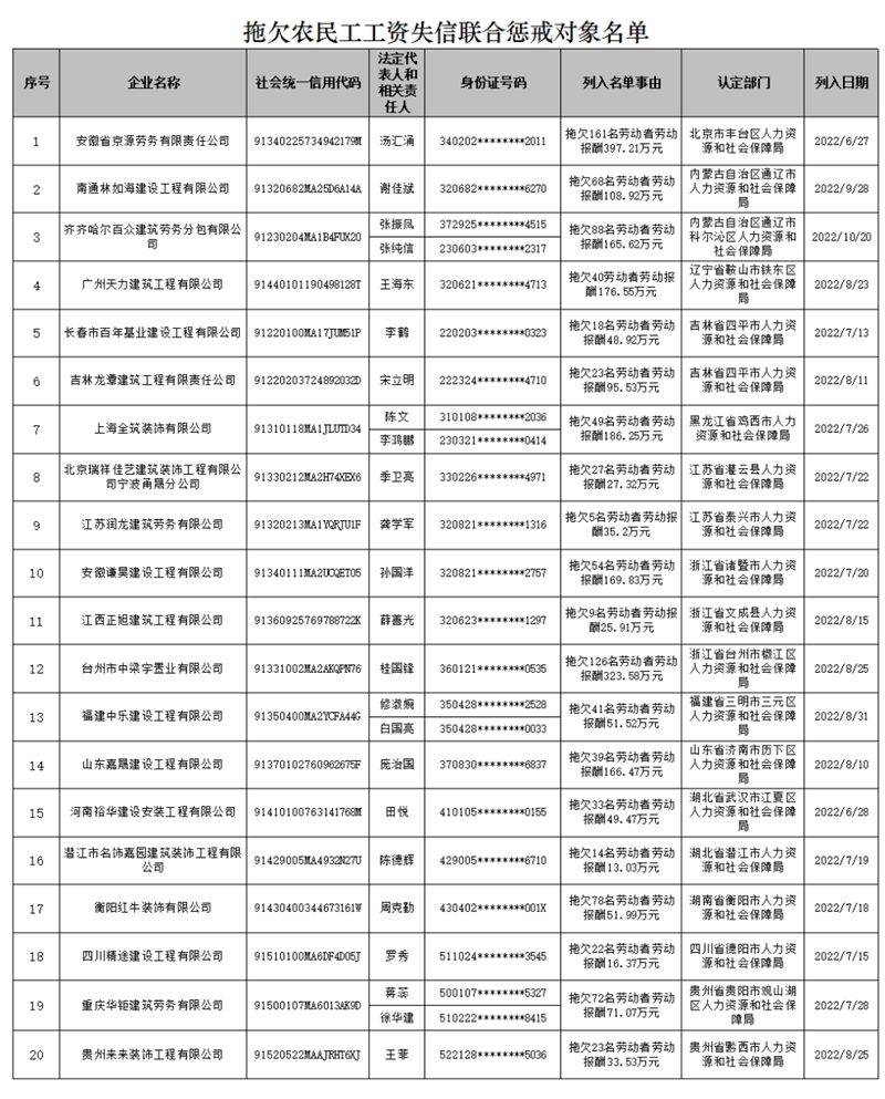 據(jù)人力資源和社會(huì)保障部公眾號(hào),根據(jù)《拖欠農(nóng)民工工資失信聯(lián)合懲戒對(duì)象名單管理暫行辦法》(人力資源和社會(huì)保障部令第45號(hào)),人力資源社會(huì)保障部現(xiàn)公布一批拖欠農(nóng)民工工資失信聯(lián)合懲戒對(duì)象名單。