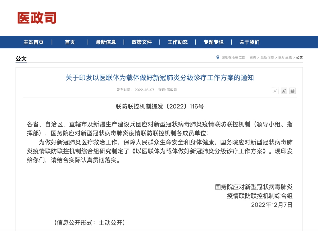 新華社北京12月7日電 為做好新冠肺炎醫(yī)療救治工作,全力保障高齡合并基礎疾病等重癥風險較高的感染者及時救治,構建更加科學有序的就醫(yī)秩序,國務院聯(lián)防聯(lián)控機制綜合組12月7日發(fā)布《以醫(yī)聯(lián)體為載體做好新冠肺炎分級診療工作方案》。