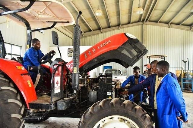 中方援建的喀麥隆亞巴西農(nóng)業(yè)職業(yè)技術(shù)中學(xué)里,學(xué)生們在上拖拉機實踐課。