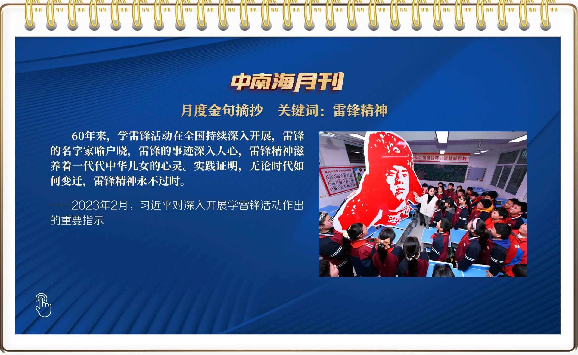 2月“關(guān)聯(lián)人物”中,雷鋒的名字家喻戶曉。在毛澤東等老一輩革命家為雷鋒同志題詞60周年之際,習(xí)近平總書記作出重要指示,一語道出了雷鋒精神的歷史厚度:“實踐證明,無論時代如何變遷,雷鋒精神永不過時?!?/p>