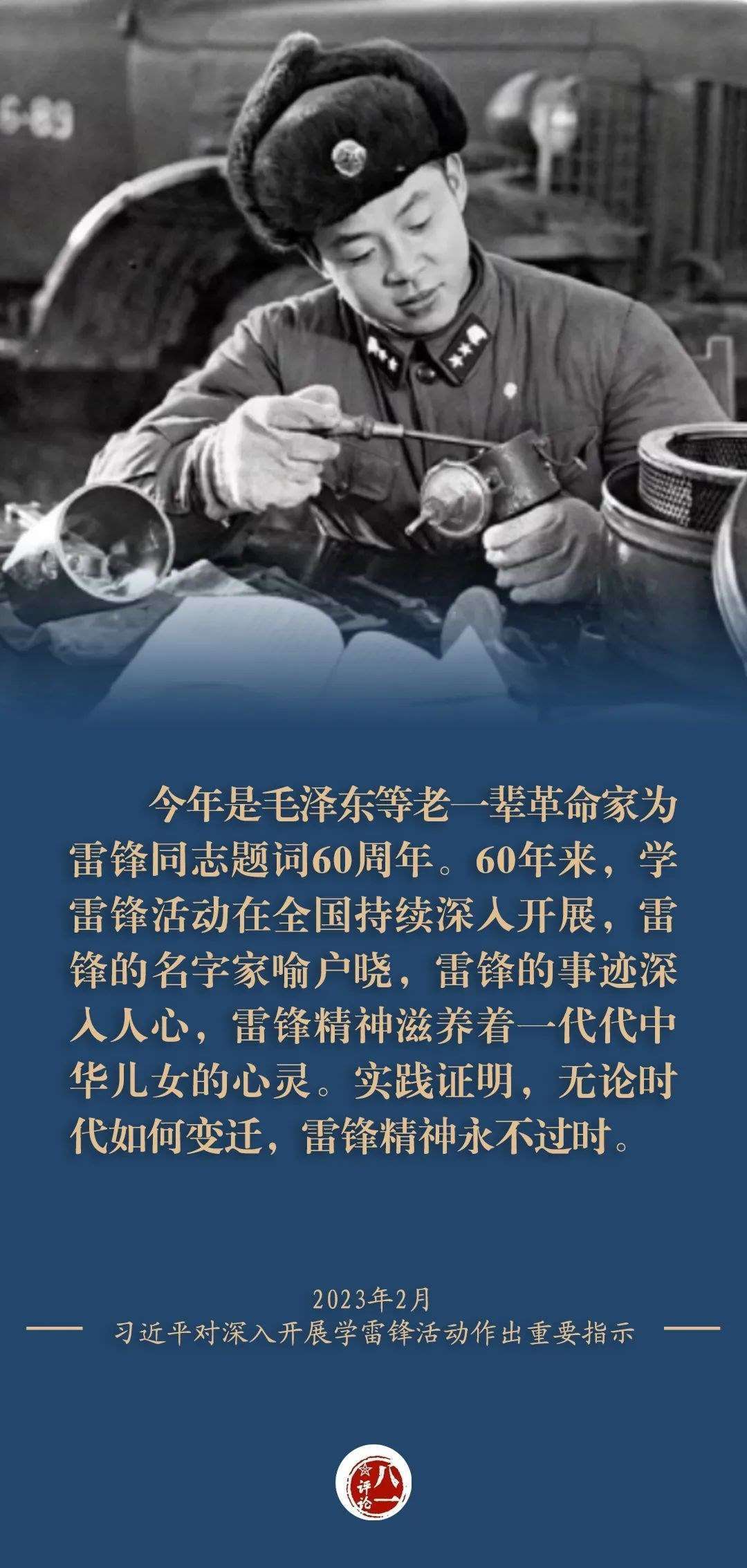 在毛澤東等老一輩革命家題詞60周年之際,習(xí)近平總書記又專門對(duì)深入開展學(xué)雷鋒活動(dòng)作出重要指示,強(qiáng)調(diào)“無論時(shí)代如何變遷,雷鋒精神永不過時(shí)”,要“讓學(xué)雷鋒活動(dòng)融入日常、化作經(jīng)常,讓雷鋒精神在新時(shí)代綻放更加璀璨的光芒”,為新時(shí)代更好弘揚(yáng)雷鋒精神指明了方向。