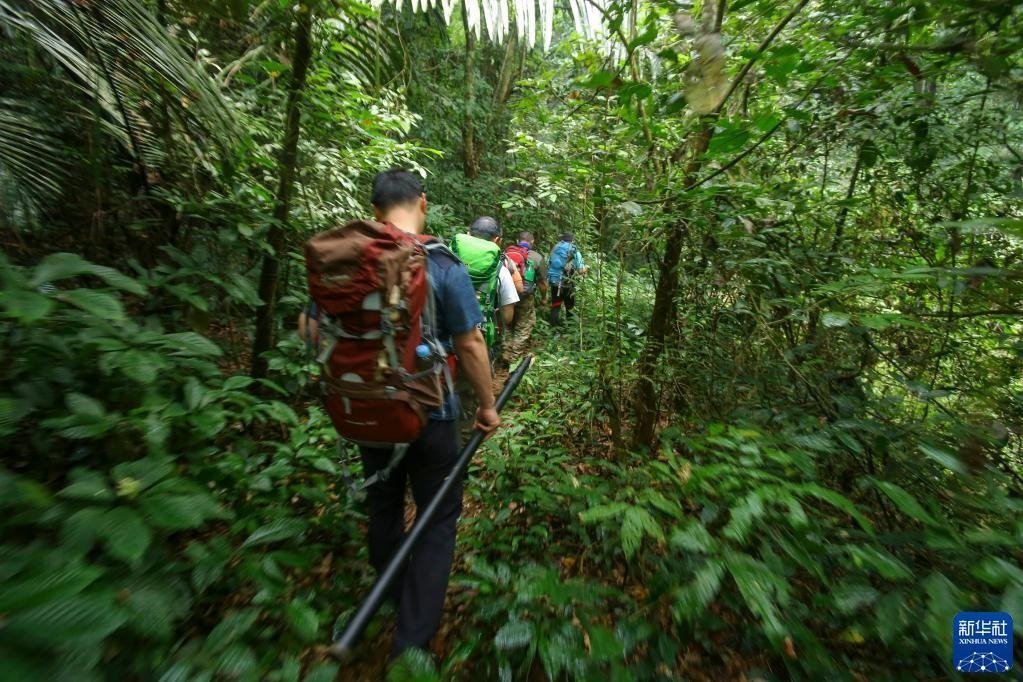 3月16日,聯(lián)合科考隊成員穿行在密林中。   新華社發(fā)(徐健 攝)