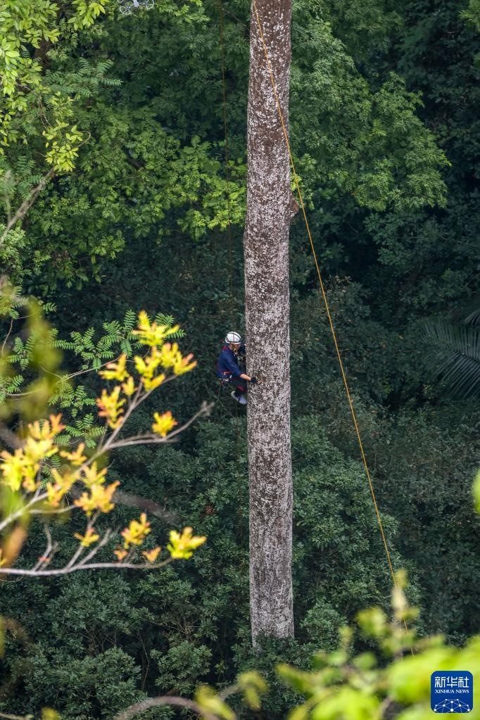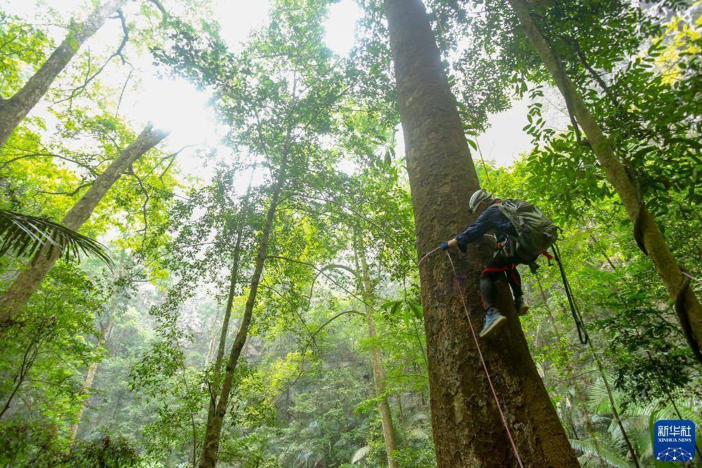 3月15日,南寧藍天救援隊的黃賢銘在攀爬望天樹,準備安裝測量樹高的超聲波信標。   新華社發(fā)(農(nóng)正權(quán) 攝)