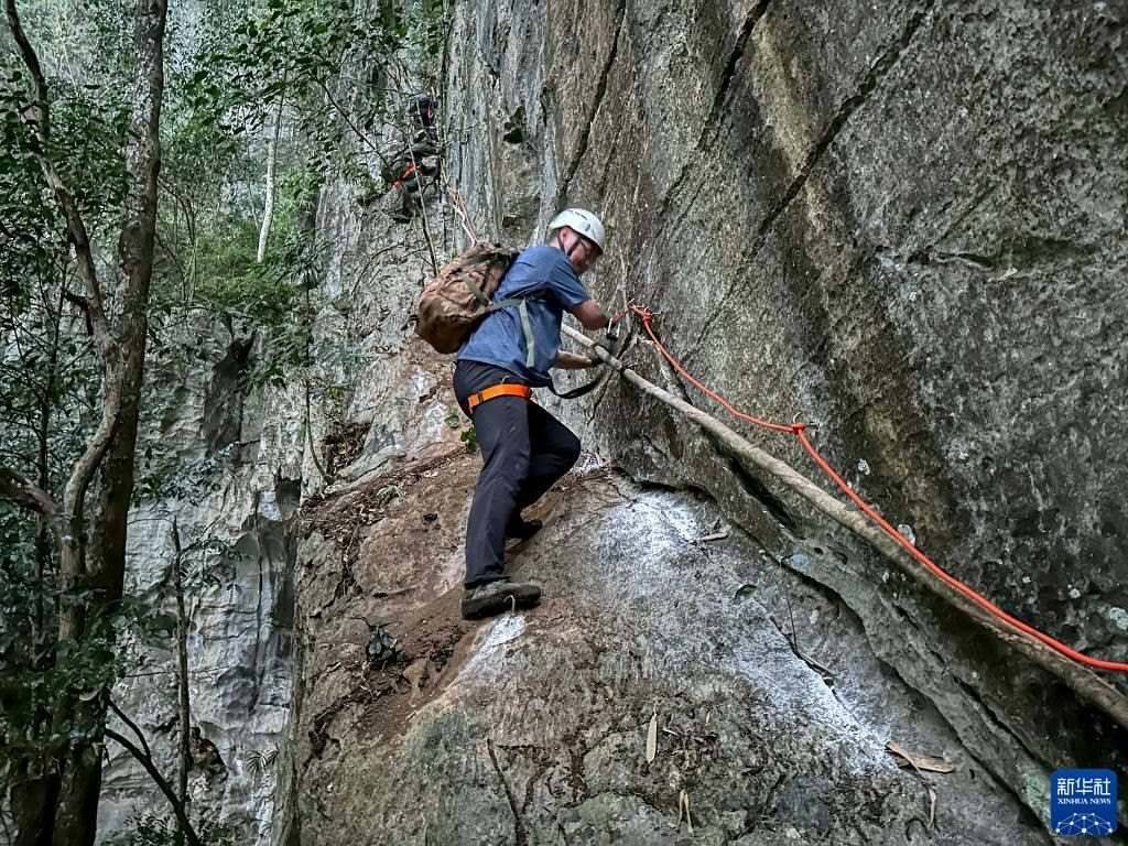 3月15日,聯(lián)合科考隊成員、廣西植物研究所的王斌在科考途中攀爬巖壁。   新華社發(fā)(徐健 攝)