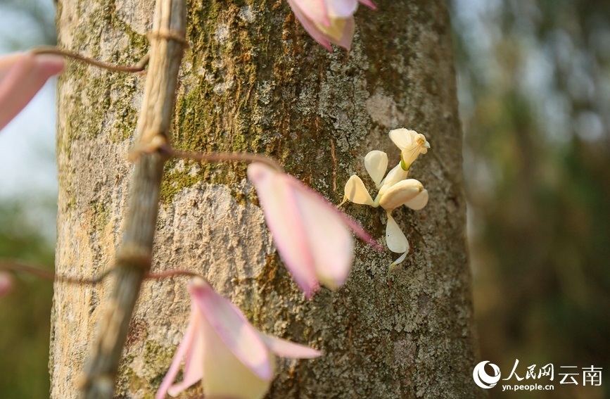 周會蘭介紹,4月12日早上,她吃過早飯后來到自家附近的山上采摘可食用的白花,在一條箐溝旁的樹林陡坡處,她采摘了一些白花后,轉(zhuǎn)身開始撿拾落在草叢中的白花。“突然,一朵白色的花引起了我的注意,當我伸手去撿時,這朵花竟然自己挪了個位置?!敝軙m說,當時覺得很奇怪,花還會自己動,慢慢才發(fā)現(xiàn)是一只蟲子。