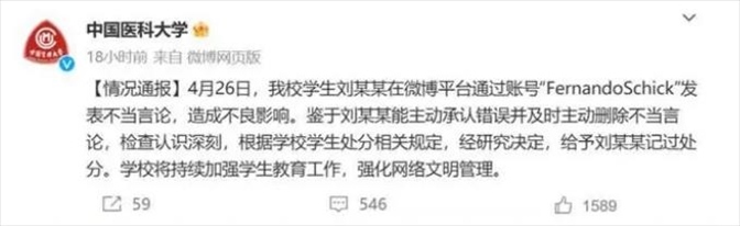 ·在本周中超聯(lián)賽的大連人vs成都蓉城的比賽后,兩隊(duì)的球迷出現(xiàn)了一些沖突。有球迷發(fā)現(xiàn)一名大學(xué)生在網(wǎng)上用5.12地震來攻擊刺激成都球迷,該生所屬中國醫(yī)科大學(xué)通報(bào),給予其記過處分。