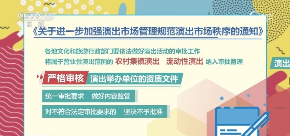 通知指出,各地文化和旅游行政部門要依法做好演出活動(dòng)的審批工作,將屬于營(yíng)業(yè)性演出范圍的農(nóng)村集鎮(zhèn)演出、流動(dòng)性演出納入審批管理,嚴(yán)格審核演出舉辦單位的資質(zhì)文件,統(tǒng)一審批要求,做好內(nèi)容監(jiān)管。對(duì)不符合法定審批要求的,堅(jiān)決不予批準(zhǔn)。文化和旅游行政部門要定期對(duì)演出場(chǎng)所進(jìn)行檢查,督促演出場(chǎng)所定期開(kāi)展設(shè)施設(shè)備檢查,落實(shí)安全生產(chǎn)責(zé)任制。督促演出場(chǎng)所建立完善現(xiàn)場(chǎng)巡查制度,指定專人負(fù)責(zé)演出活動(dòng)的巡查,做好現(xiàn)場(chǎng)觀眾管理,堅(jiān)決防止擁擠、踩踏等事故發(fā)生,確保演出現(xiàn)場(chǎng)安全。各地文化和旅游行政部門要將社會(huì)關(guān)注度高、票務(wù)供需緊張的營(yíng)業(yè)性演出作為重點(diǎn)監(jiān)管對(duì)象,提前進(jìn)行研判。督促演出舉辦單位、演出票務(wù)經(jīng)營(yíng)單位面向市場(chǎng)公開(kāi)銷售的營(yíng)業(yè)性演出門票數(shù)量,不得低于核準(zhǔn)觀眾數(shù)量的70%。對(duì)在票務(wù)經(jīng)營(yíng)中發(fā)現(xiàn)有炒票問(wèn)題或可能造成不良影響的,應(yīng)當(dāng)及時(shí)約談演出舉辦單位和演出票務(wù)經(jīng)營(yíng)單位,督促整改。要聯(lián)合屬地公安、市場(chǎng)監(jiān)管等部門,依法打擊“黃牛”炒票、虛假宣傳等違法違規(guī)行為,切實(shí)保障消費(fèi)者合法權(quán)益。