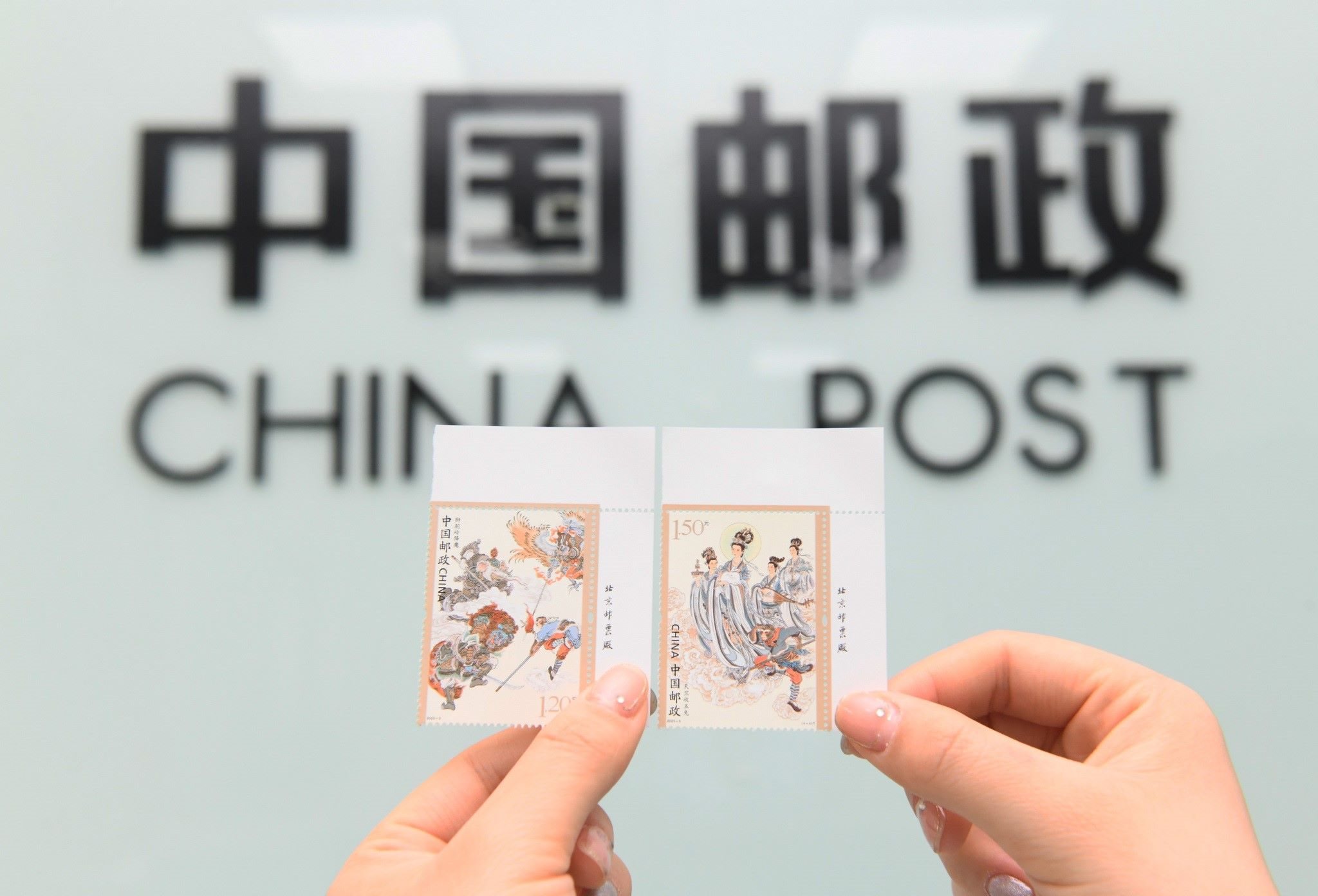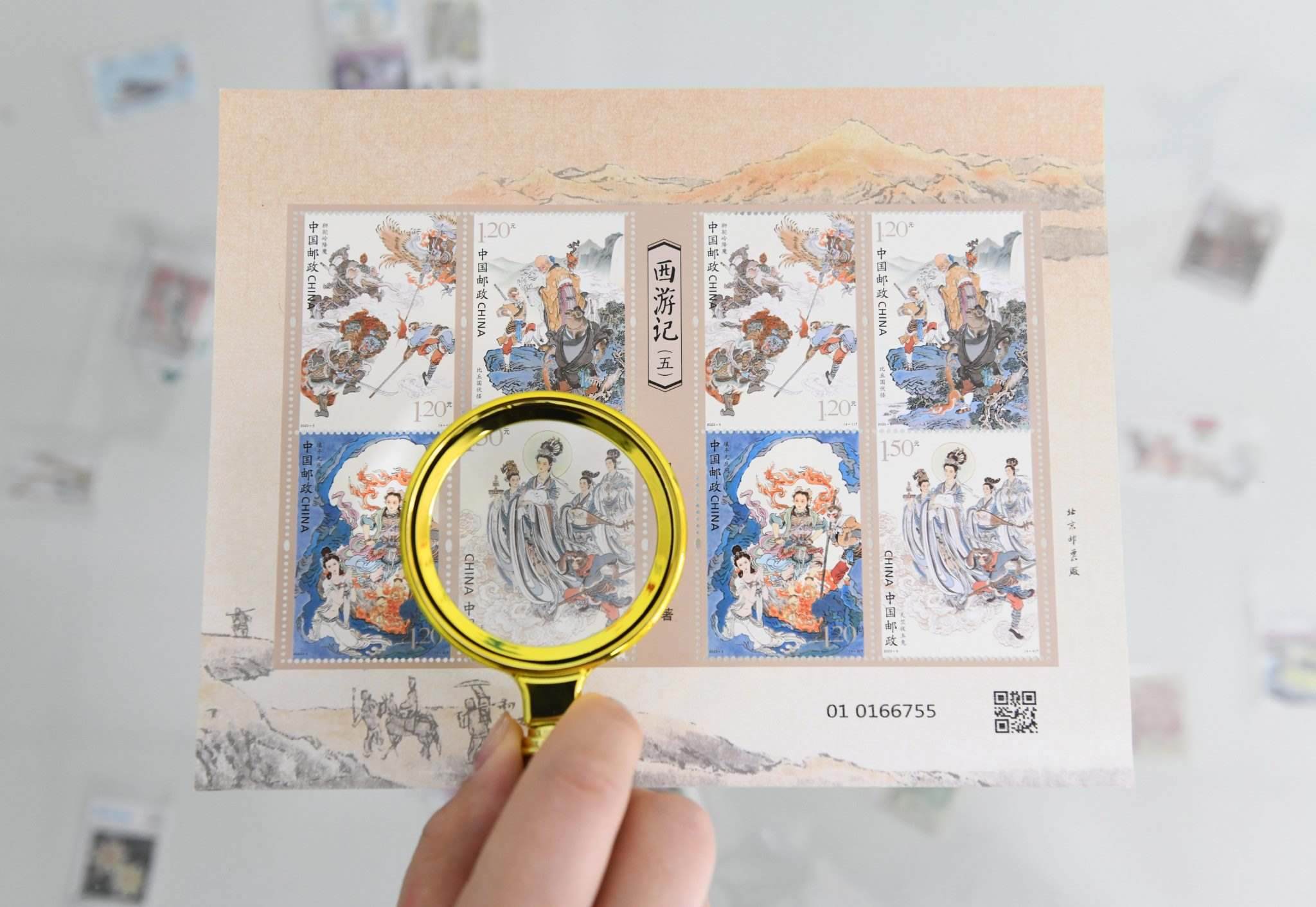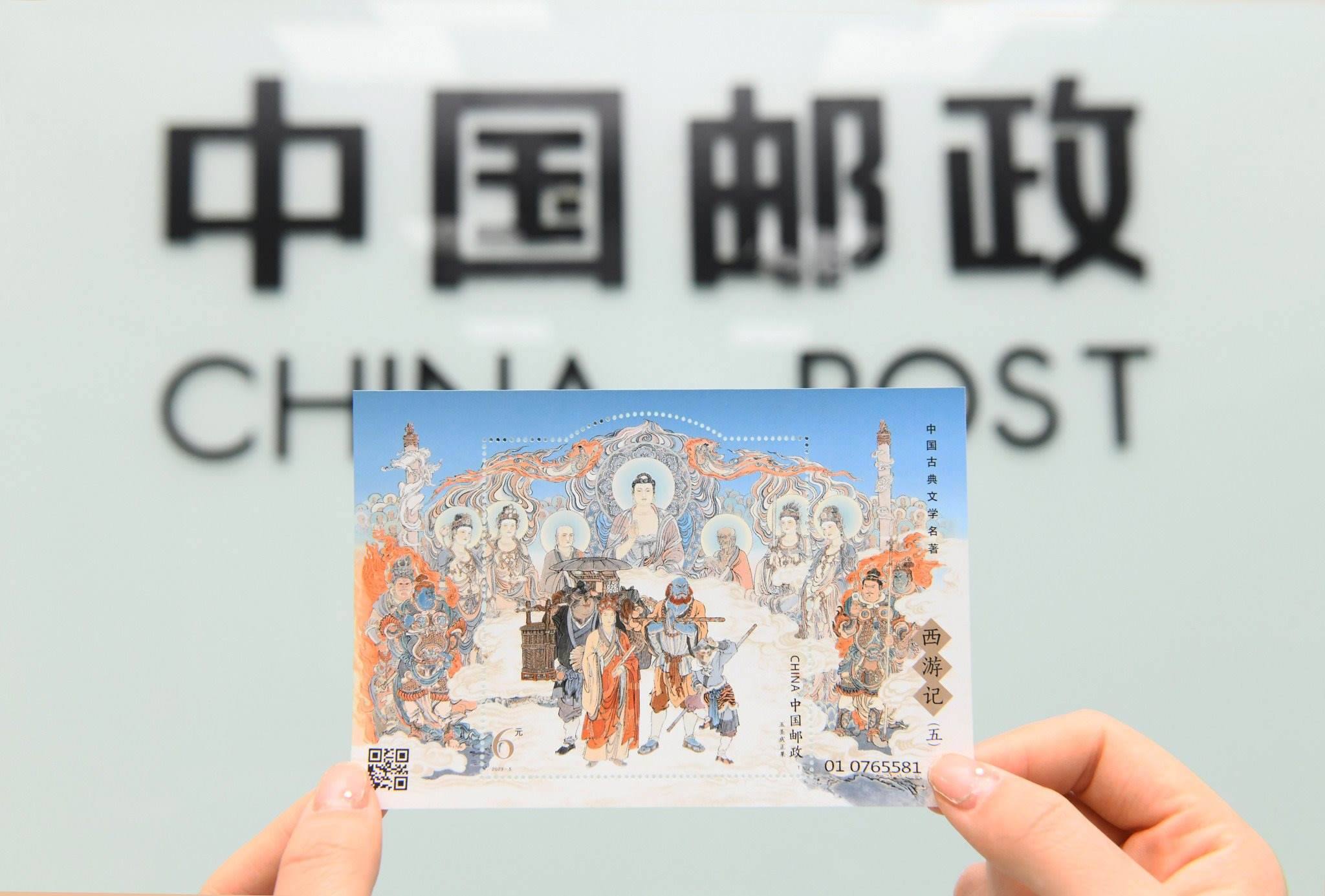 2023年4月27日,中國郵政集團公司河北省新樂市分公司,工作人員展示發(fā)行的《中國古典文學(xué)名著—<西游記>(五)》特種郵票。視覺中國