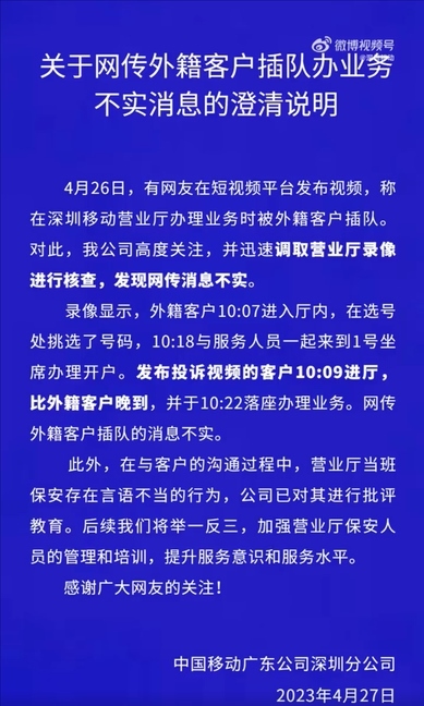 ·深圳移動否認(rèn)“外籍客戶插隊(duì)”:調(diào)錄像核查,發(fā)布投訴視頻的客戶晚到。