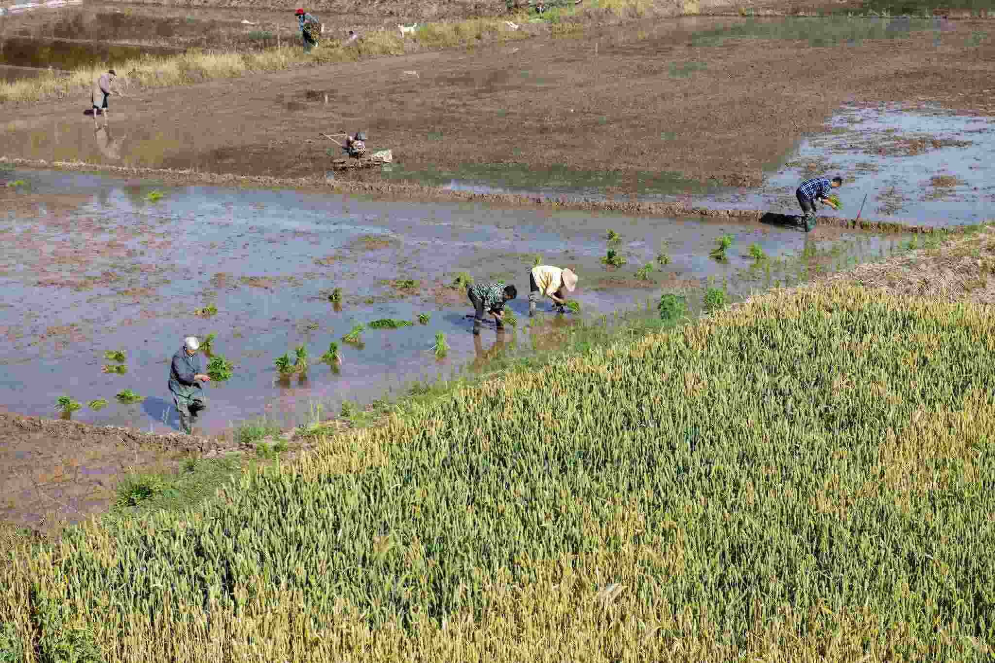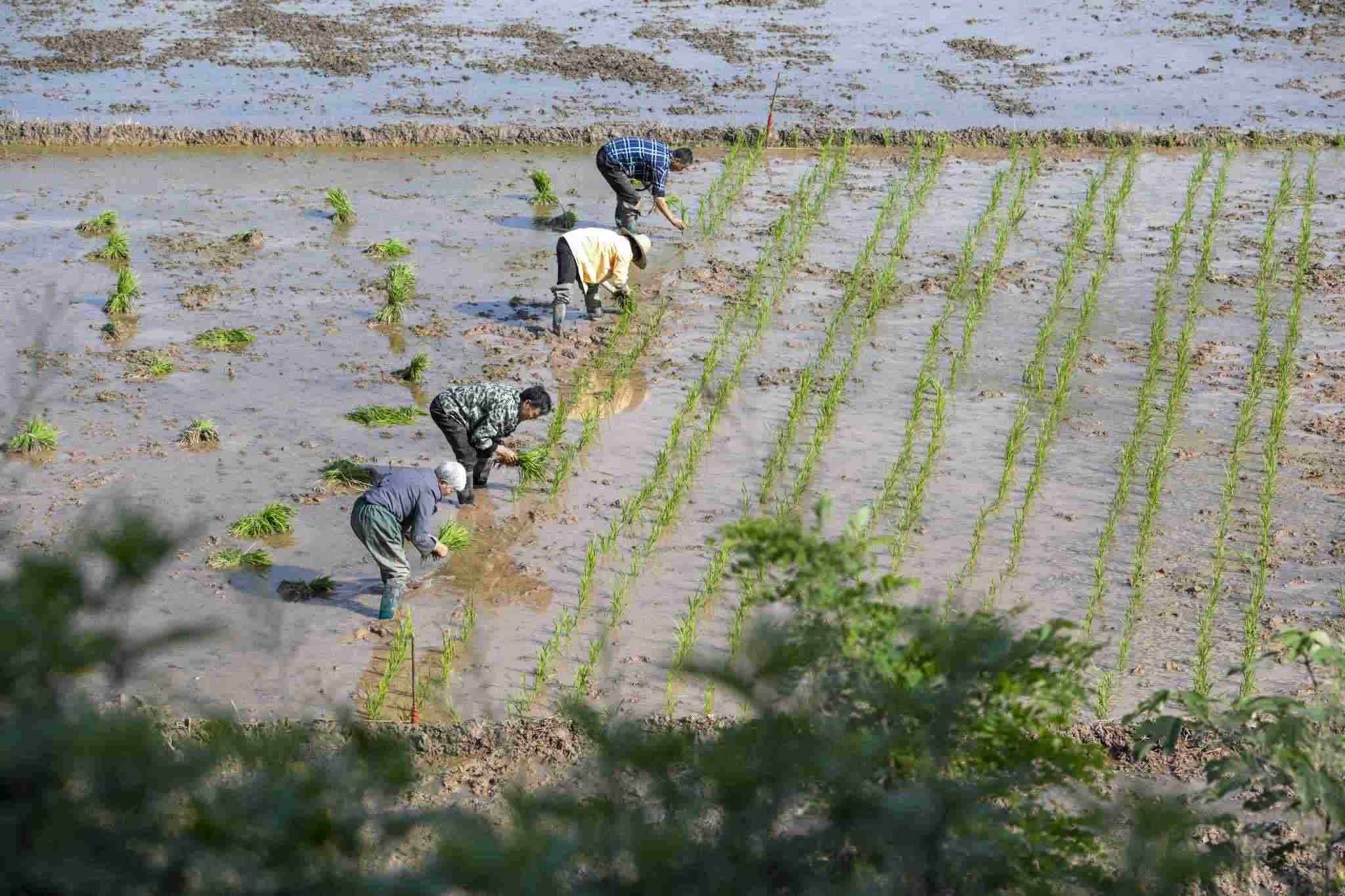 2023年4月30日,四川閬中,暮春時(shí)節(jié),村民在囤水田栽插早稻,處處可見(jiàn)搶抓農(nóng)時(shí)的忙碌身影。視覺(jué)中國(guó)