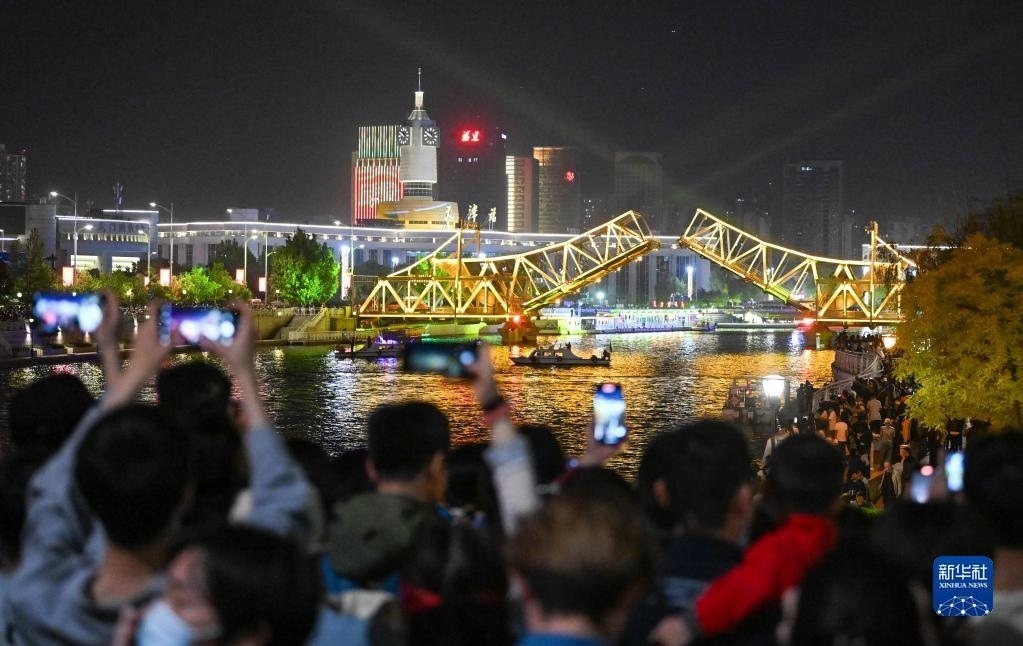 5月1日晚,位于天津海河上的標(biāo)志性建筑物解放橋橋梁開啟,橋梁開啟角度達(dá)到最大角度60度。