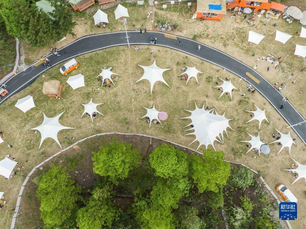 5月1日,游客在貴州省畢節(jié)市赫章縣硐上村游玩(無人機(jī)照片)。   新華社發(fā)(羅大富 攝)