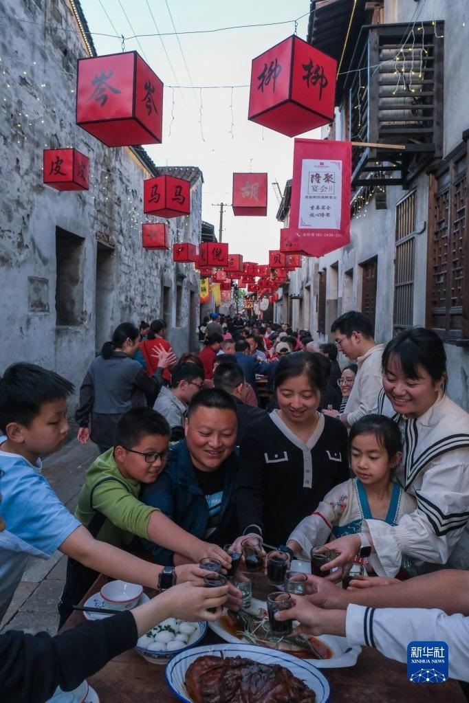 5月1日,在浙江嘉興桐鄉(xiāng)市崇福鎮(zhèn)運(yùn)河文化歷史街區(qū)的橫街上,游客參加古鎮(zhèn)特色長街宴。   新華社記者 徐昱 攝