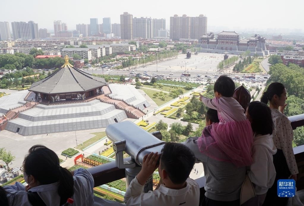 5月1日,游客在河南洛陽隋唐洛陽城國家遺址公園游覽。   新華社記者 侯俊 攝