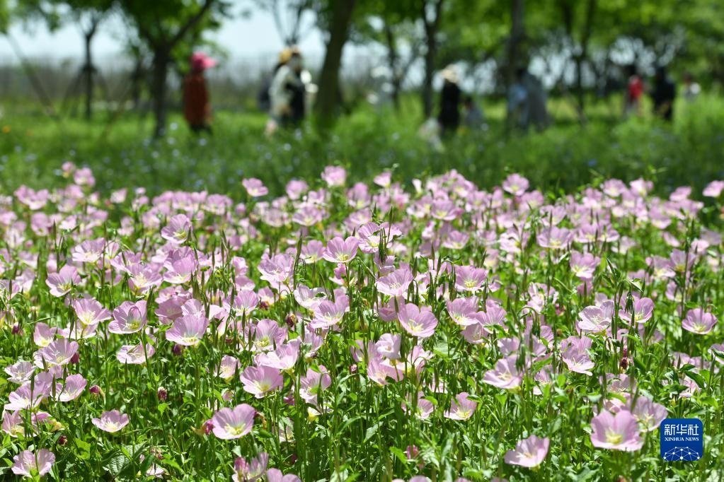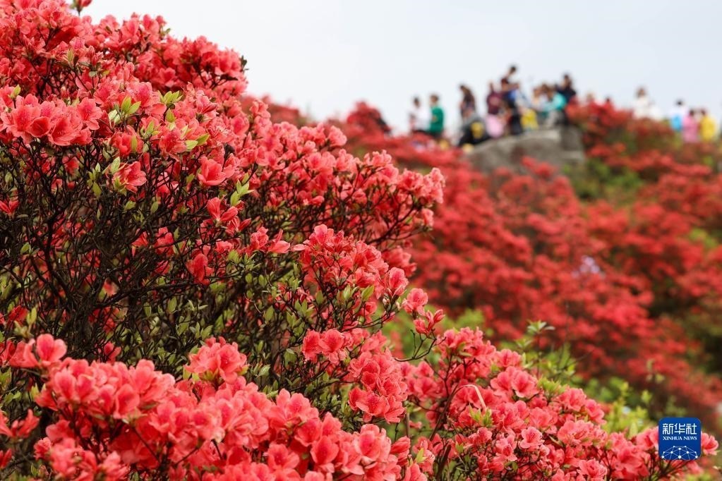 5月1日,游客在貴州省黔東南苗族侗族自治州丹寨縣龍泉山景區(qū)賞花游玩。   新華社發(fā)(楊勝賢 攝)