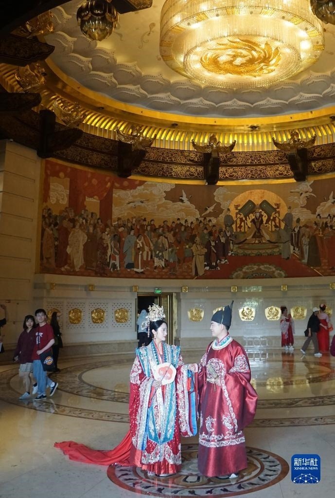 5月1日,兩名古裝愛好者在河南洛陽隋唐洛陽城國家遺址公園留影。   新華社記者 侯俊 攝
