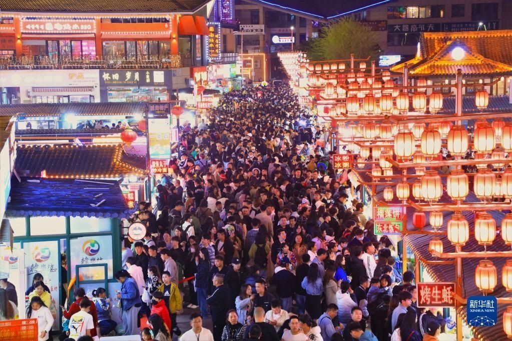 4月30日,游客在山東省威海市韓樂坊夜市品美食、逛夜市。   新華社發(fā)(朱春曉 攝)
