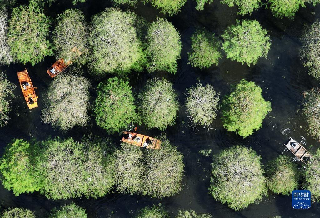 5月1日,游客在江蘇省揚(yáng)州市淥洋湖濕地公園的水上森林乘船游覽(無人機(jī)照片)。   新華社發(fā)(孟德龍 攝)