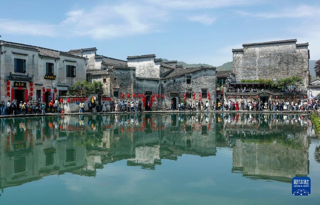 4月30日,游客在安徽省黃山市黟縣宏村參觀游玩。   新華社發(fā)(施亞磊 攝)