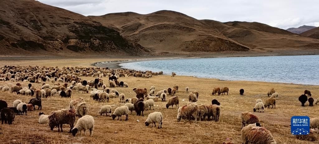 羊卓雍錯湖邊的羊群(5月1日攝,手機照片)。