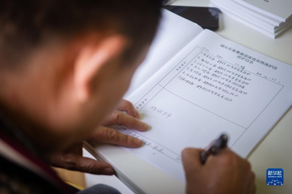 4月29日,在石首麋鹿國(guó)家級(jí)自然保護(hù)區(qū),巡護(hù)員劉吉高填寫(xiě)巡護(hù)日志。   新華社記者 伍志尊 攝