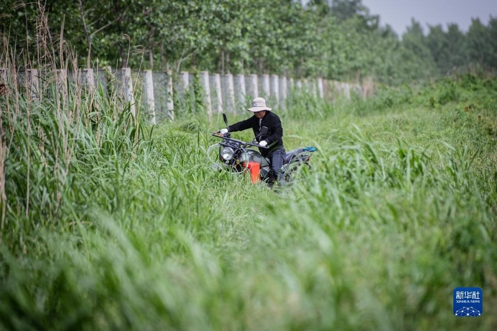 4月29日,在石首麋鹿國(guó)家級(jí)自然保護(hù)區(qū),巡護(hù)員王傳軍騎車(chē)在齊腰高的野草中巡邏。   新華社記者 伍志尊 攝