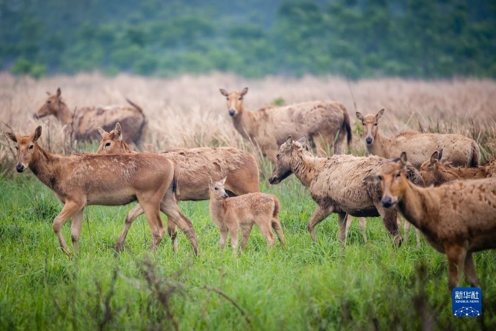 4月28日,一群麋鹿帶著幼鹿在石首麋鹿國(guó)家級(jí)自然保護(hù)區(qū)活動(dòng)。