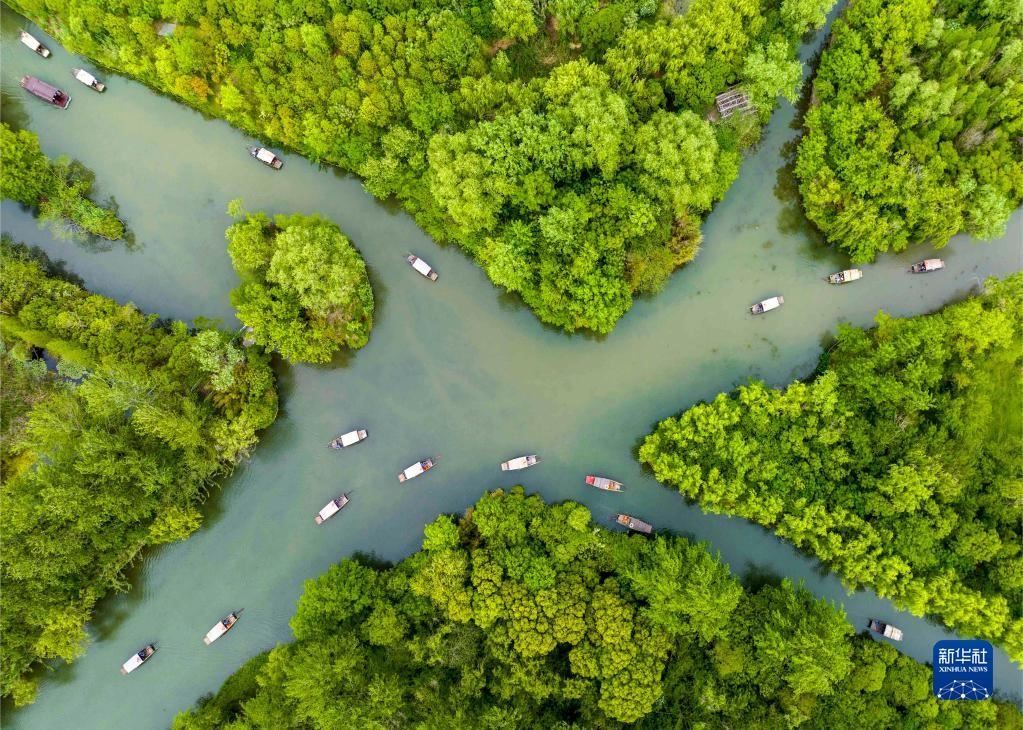 5月2日,游客在江蘇省泰州市姜堰區(qū)溱湖國(guó)家濕地公園內(nèi)乘坐搖櫓船游玩(無(wú)人機(jī)照片)。