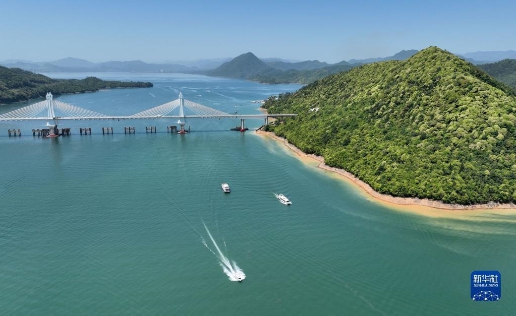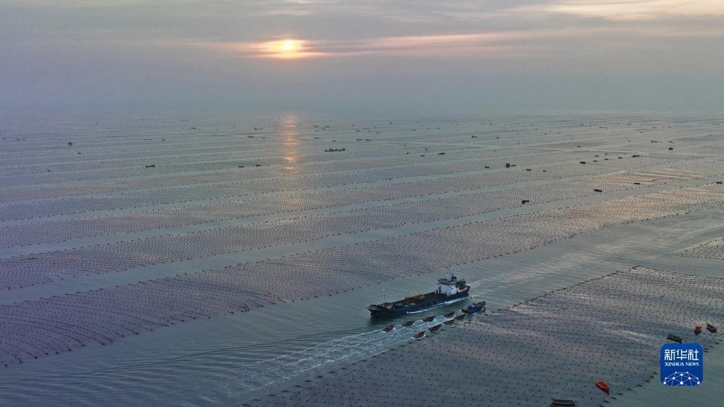 5月2日,在山東省榮成市愛(ài)倫灣海洋牧場(chǎng),收獲海帶的養(yǎng)殖船和運(yùn)輸鮑魚(yú)的運(yùn)鮮船在養(yǎng)殖區(qū)穿梭(無(wú)人機(jī)照片)。