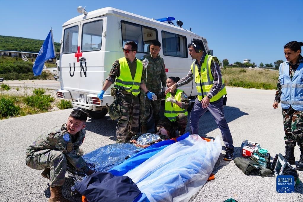 5月3日,在黎巴嫩南部邊境“藍(lán)線”附近雷場(chǎng),參與演習(xí)的中國(guó)第21批赴黎巴嫩維和多功能工兵分隊(duì)醫(yī)療組對(duì)“傷員”傷情進(jìn)行前期處置。