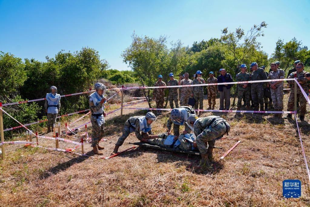 5月3日,在黎巴嫩南部邊境“藍(lán)線”附近雷場(chǎng),參與演習(xí)的中國(guó)第21批赴黎巴嫩維和多功能工兵分隊(duì)隊(duì)員將“傷員”轉(zhuǎn)運(yùn)出雷場(chǎng)。