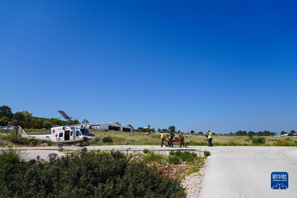 5月3日,在黎巴嫩南部邊境“藍(lán)線”附近雷場(chǎng),參與演習(xí)的中國(guó)第21批赴黎巴嫩維和多功能工兵分隊(duì)隊(duì)員使用救援直升機(jī)轉(zhuǎn)運(yùn)“傷員”。