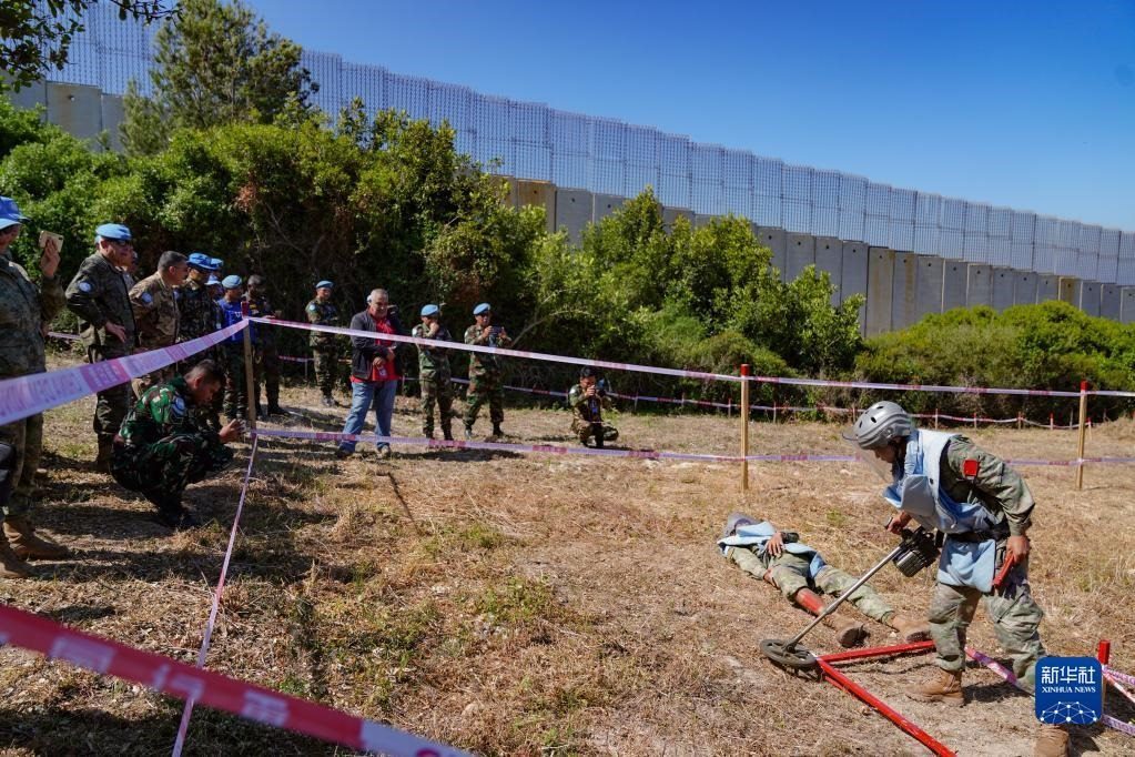 5月3日,在黎巴嫩南部邊境“藍(lán)線”附近雷場(chǎng),參與演習(xí)的中國(guó)第21批赴黎巴嫩維和多功能工兵分隊(duì)掃雷作業(yè)手開辟救援通道。