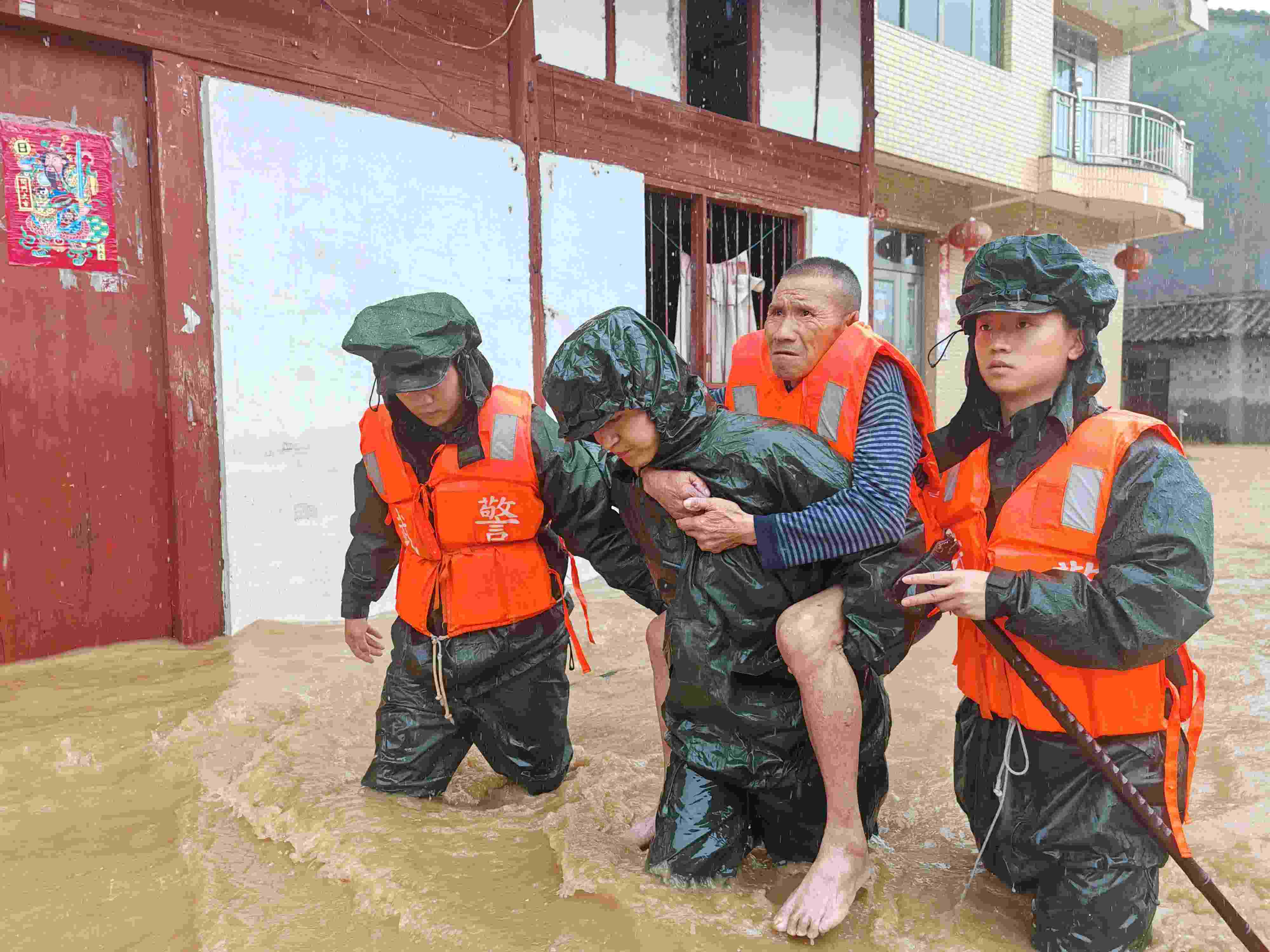 2023年5月6日,江西撫州,宜黃縣梨溪鎮(zhèn),武警撫州支隊(duì)官兵在轉(zhuǎn)移被困群眾。 視覺中國