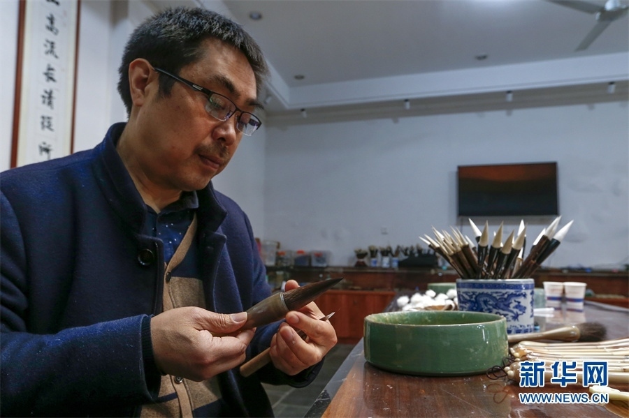 一支好的徽筆,不僅要保留傳統(tǒng)工藝,且要在原基礎(chǔ)上不斷創(chuàng)新、改良。楊文尤其重視書畫家對筆的使用反饋:“因為他們對用筆最挑剔,而且現(xiàn)代書畫家創(chuàng)作方式和作品不斷創(chuàng)新,對毛筆也有新的要求,他們提出的要求我總是盡力去滿足,也使得制筆技藝進(jìn)一步得到了提高?!? 新華網(wǎng)發(fā)(施亞磊 攝)