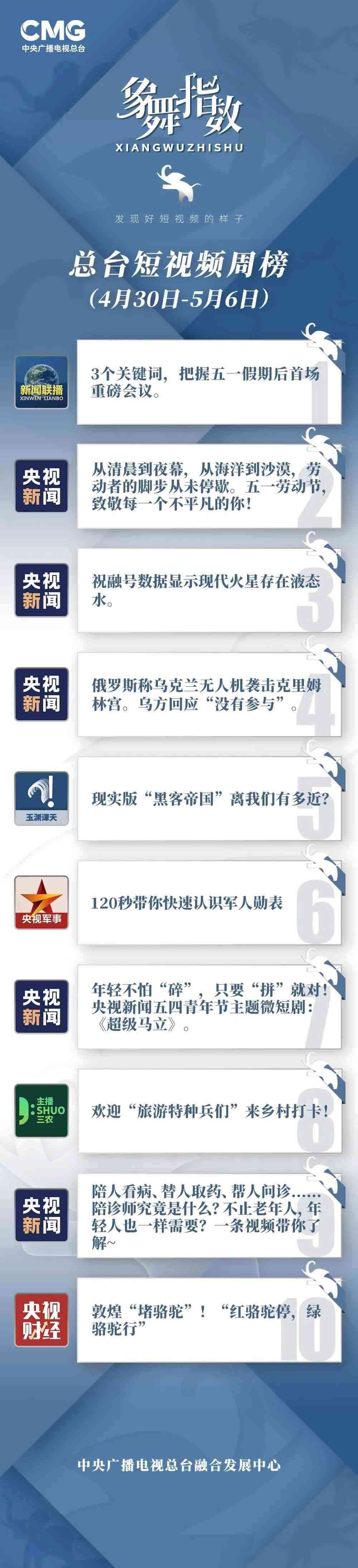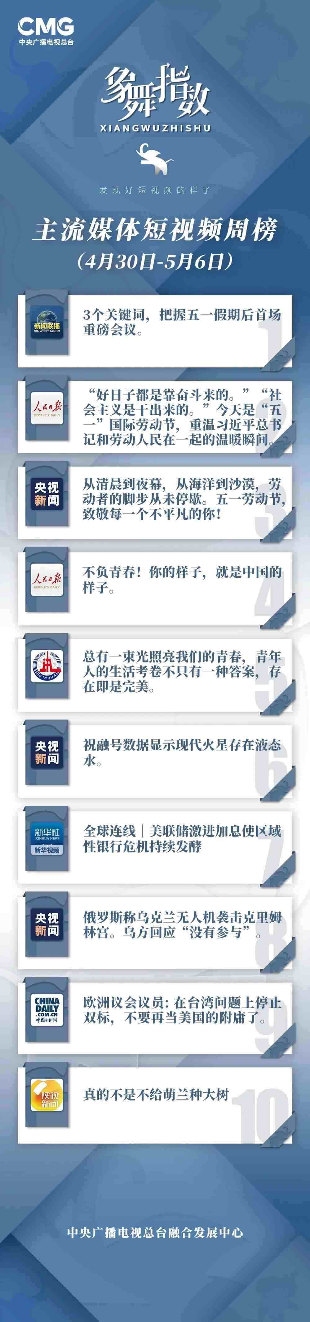 中央廣播電視總臺“象舞指數(shù)”評議品牌,推出主流媒體短視頻周榜、總臺短視頻周榜。在2023年4月30日—5月6日,這些內(nèi)容引發(fā)大眾關(guān)注: