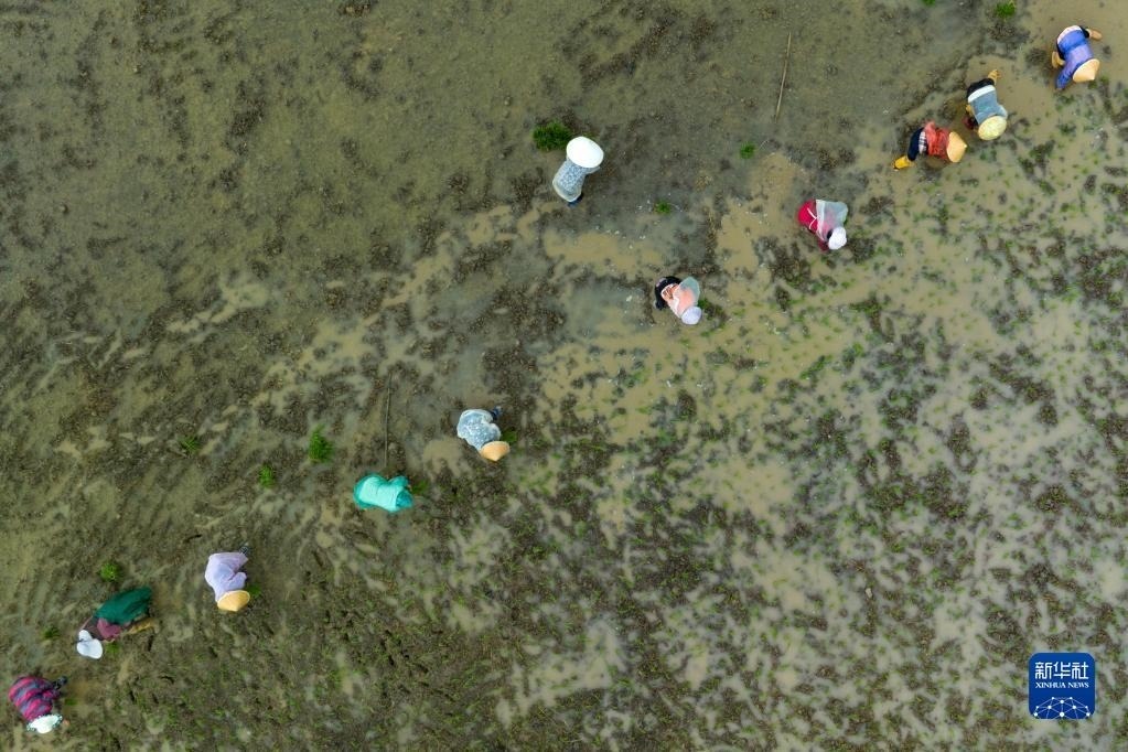 5月9日,在四川省崇州市道明鎮(zhèn)協(xié)和社區(qū),農(nóng)民在一片高標(biāo)準(zhǔn)農(nóng)田里種植水稻(無(wú)人機(jī)照片)。
