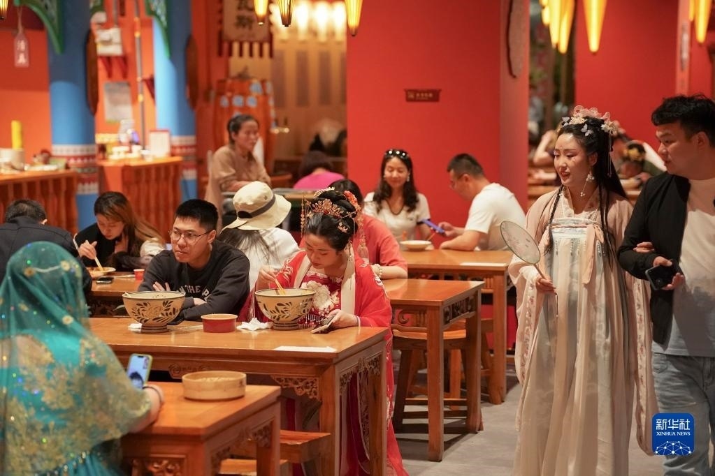 5月11日,游客在西安“長安十二時辰”主題街區(qū)內用餐。