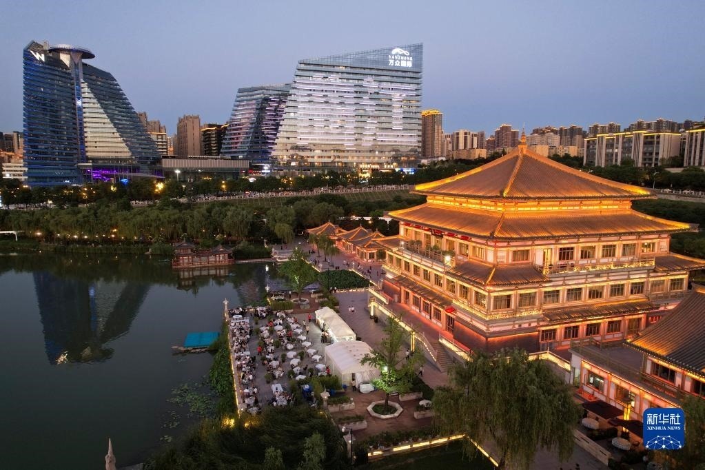西安曲江新區(qū)日落時分的城市景色(2022年6月14日攝,無人機照片)。