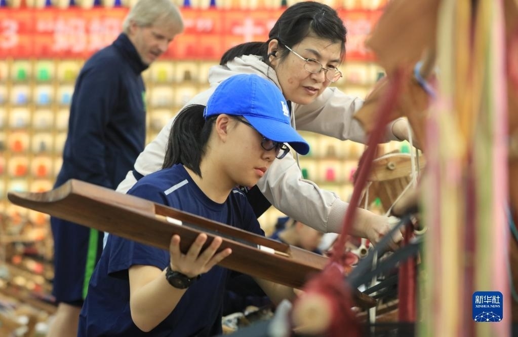 5月12日,來(lái)自上海包玉剛實(shí)驗(yàn)學(xué)校的學(xué)生在張家界市武陵源區(qū)乖幺妹土家族織錦基地學(xué)習(xí)體驗(yàn)土家族織錦非遺技藝。