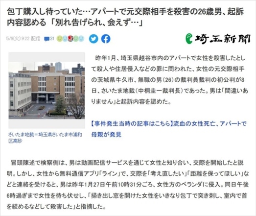·日本茨城縣牛久市一名26歲失業(yè)男子因不滿女友提分手,潛入女方家陽臺(tái)蹲守近8小時(shí),等她出來收衣服時(shí)將其殺害。